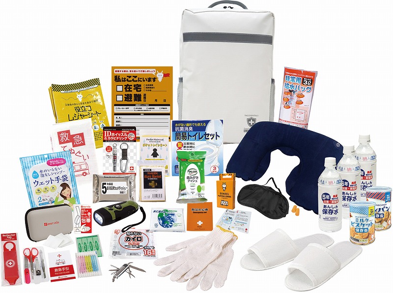 収納リュック・リフレクター・IDホイッスル&カラビナリング・軍手・カンパン・ウェットティッシュ・アルミブランケット・防災の心得・ダイナモ多機能ライト・ミルクビスケット・給水袋3L・スリッパ・カイロ・レインコート・8徳ナイフ・ネックピロー・アイマスク・耳栓・救急てぬぐい・ウェット手袋・レジャーシート・緊急避難カード・抗菌消臭簡易トイレ3回分・救急10点セット・歯磨きティッシュ・トランプ・水に流せるペーパー・5年保存水500ml×3