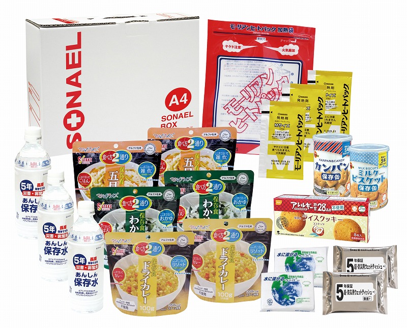 ウェットティッシュ×2・5年保存水500ml×3・ライスクッキー・カンパン・ミルクビスケット・マジックライス(わかめ・五目・ドライカレー)×各2、加熱袋・発熱剤×3・水に流せるペーパー×2