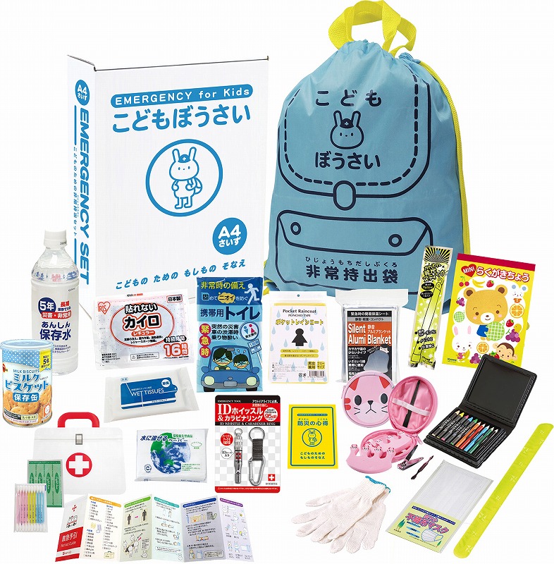 非常用持出袋・反射リストバンド・落書き帳・アートセット・防災の心得・軍手・IDホイッスル&カラビナリング・カイロ・レインコート・携帯用トイレ1P・発光スティック・静音アルミブランケット・マスク・5年保存水500ml・ミルクビスケット75g・除菌アルコールウェットティッシュ・ネイルケアセット・水に流せるペーパー・救急4点セット