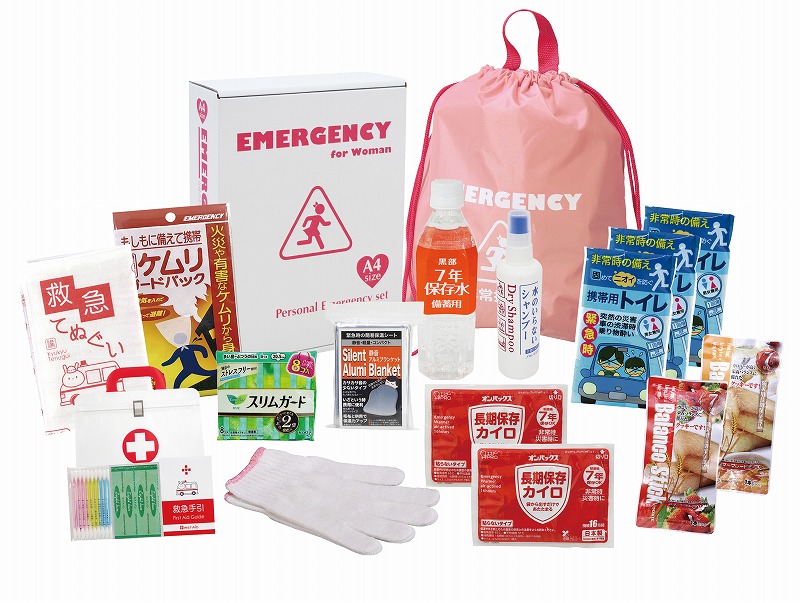 被災当日の滞在をサポートする災害対策セットに女性ならではの商品をプラス。コンパクトなA4箱に収納できるので棚や引き出しで保管しやすいです。