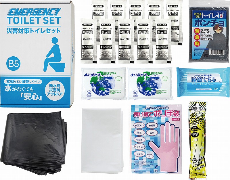 抗菌剤入凝固剤×10・排便処理袋×10・収納外袋×1・水に流せるペーパー×2・除菌アルコールウェットティッシュ・発光スティック・トイレポンチョ・ポリ手袋