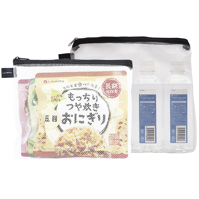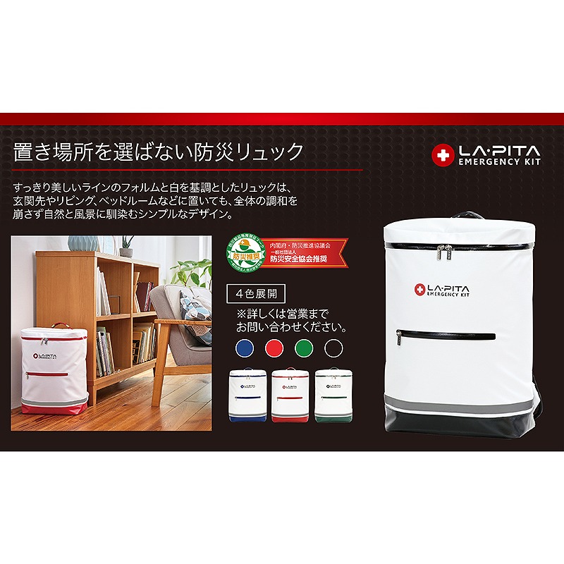 防水仕様リュック(24L)(800g)×1(460×330×160mm) (材:ターポリン)、多機能ダイナモラジオライト(乾電池対応Ver)×1、ウォーターバッグMotteR10L×1、ハイブリッドレスキューシートR×1、トイレONRR(3枚入)×1、エイドチーム2×1、ぱぱっとレインコート×1、個包装マスク×1、蓄光ホイッスル×1、軍手×1、目かくしポンチョ×1、もっちりつや炊きおにぎり こんぶ×1、もっちりつや炊きおにぎり うめしそ×1、もっちりつや炊きおにぎり 五目×1、長期保存水(500ml)×4、単三乾電池(4本パック)×1、収縮式ヘルメット オサメット×1、レスキュー寝ぶくろ×1、防災エアーマットAIRGOLONRFプラス×1