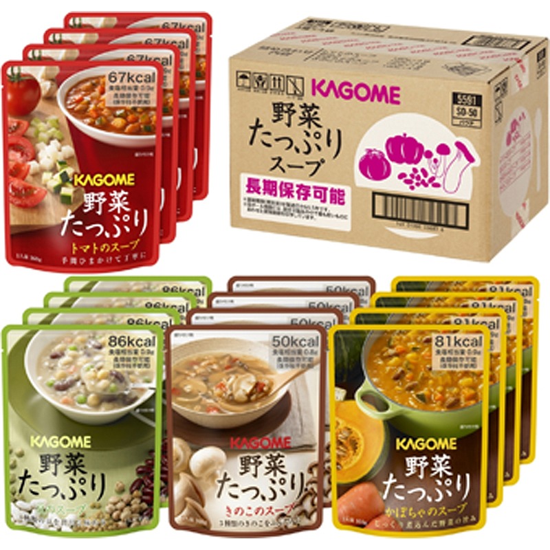トマトのスープ(160g)×4、かぼちゃのスープ(160g)×4、豆のスープ(160g)×4、きのこのスープ(160g)×4