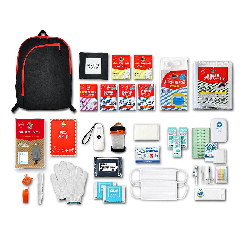 MOSHISONAデイバッグ(500g)×1(420×290×150mm) (材:ポリエステル)、レインカバー×1、4層!防寒・防風アルミシート×2、4層!防寒・防風アルミ寝袋×1、抗菌消臭・簡易トイレ×3、非常用給水袋3L×1、冷熱遮断アルミシート×1、スマホ対応ダイナモFMラジオLEDライト×1、防災ガイド×1、軍手×1、ロープ×1、笛×1、個包装マスク×2、5年保証超・防災用ウェットティッシュ20枚入×1、ペーパーソープ(10枚入)×2、多目的deポンチョ×1、除菌ジェル×3、eco便利バッグ×1、ポケットタオルペーパー10枚×1、絆創膏5枚×1、綿棒10P×1、コットンパフ3枚×1、ワンタッチ包帯×1、爪切り×1、毛抜き×1、ハサミ×1、ポケットティッシュ×1、飛び出せ!ランタン×1
