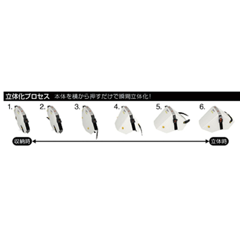 防災用の折りたたみ式ヘルメット。 保管に場所をとらず、省スペースに備蓄可能。 製品の特徴 ・力いらずでカンタンに立体化&折りたたみもワンタッチ ・着用時も快適にフィット。 ・ホイッスルを標準装備 ・反射ステッカー標準装備