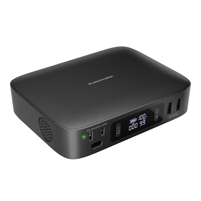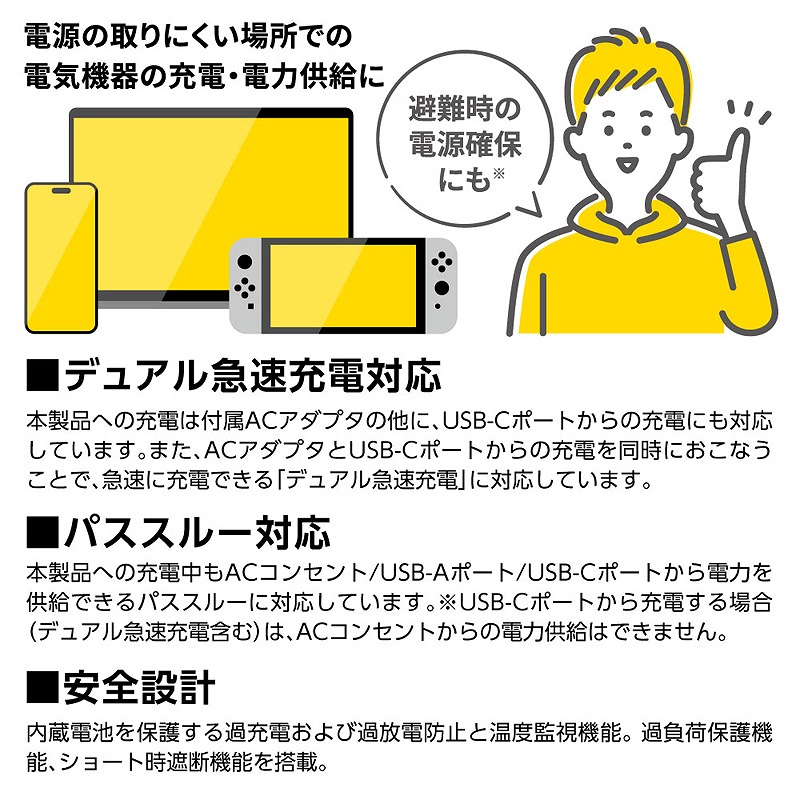 重量約750g、厚さ約35mmで軽量・コンパクト、飛行機内への持込も可能なポータブル電源。災害時の停電、ビジネス、旅行、野外作業・撮影など幅広いシーンでご利用いただけます。大容量27000mAhのリチウム電池を搭載。最大85W(疑似正弦波)出力のACコンセントを搭載。ノートパソコンやカメラ、小型の家電製品などに使用できます。スマートフォン、タブレット、ノートPCの充電に対応する45W出力のUSB-Cポートを搭載。