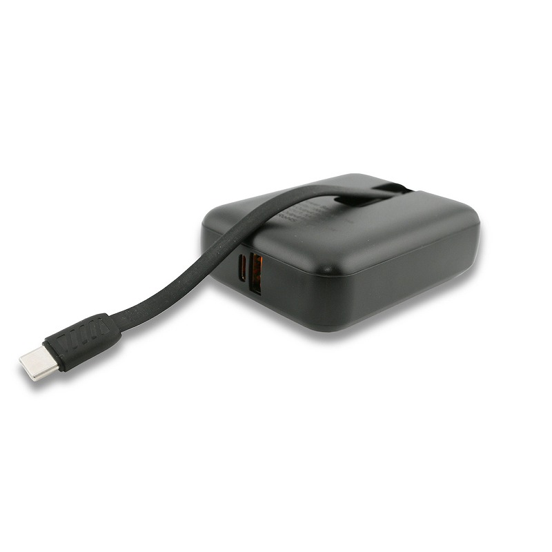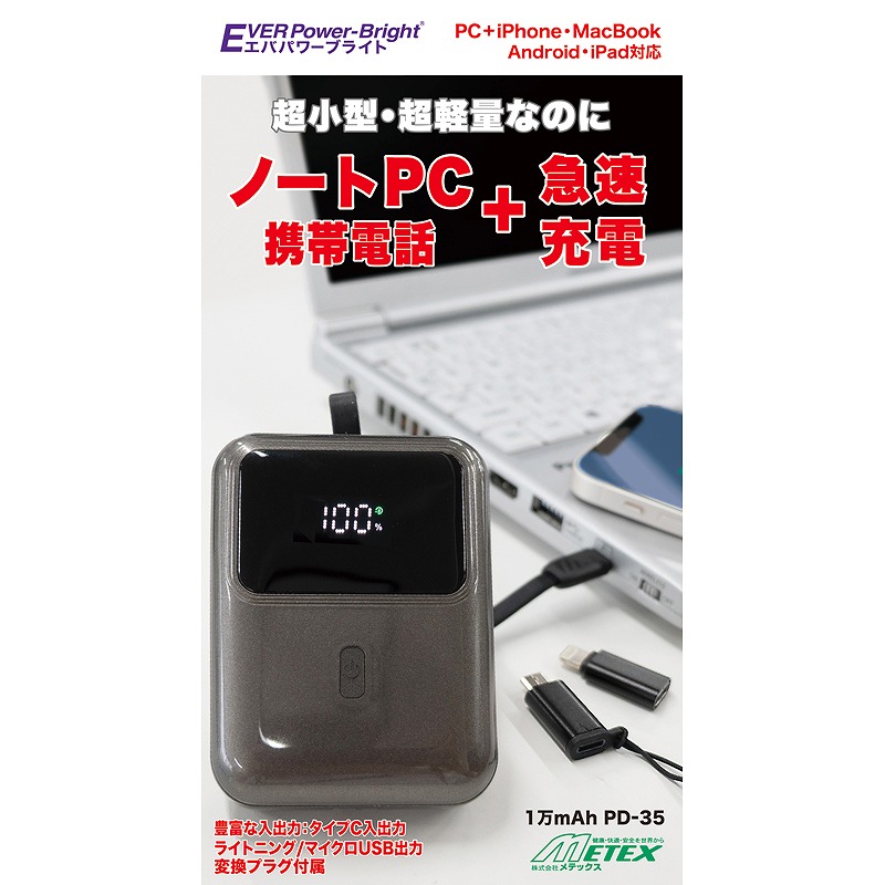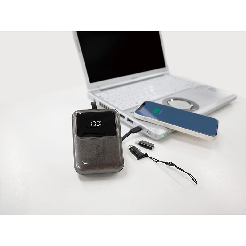タイプCケーブル内蔵、ライトニング・マイクロUSBアダプターも付属。電池容量も1万mAhあり、ノートパソコンや携帯電話、各種USB機器も急速充電。