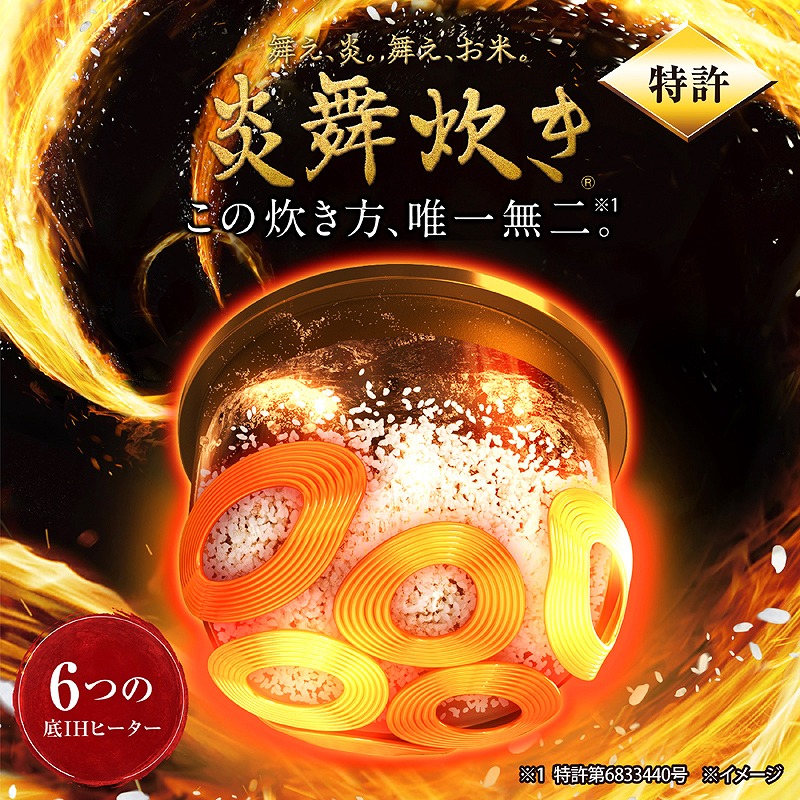 特許(第6833440号) 舞え、炎。舞え、お米。「炎舞炊き」 蓄熱性・発熱効率・熱伝導に優れた「鉄(くろがね仕込み)豪炎かまど釜」 家族好みの食感に進化する!121通りの「わが家炊き」メニュー 簡単に好みの食感に炊き分ける!15通りの「炊き分けセレクト」メニュー お手入れ簡単「蒸気口セットなし」「フラットトップパネル」「フラットフレーム(樹脂部は除く)」 炊飯や保温時の温度を細かく見張る「6つのセンサー」 直感的に操作できる「カラータッチ液晶」 炊きたてはもちろん、レンジで解凍してもふっくらおいしい「冷凍ごはん」メニュー 食べやすく、おいしく炊ける「雑穀米炊き分け3コース」 芯までやわらかい「おかゆ」メニュー&ごはんの粒感が感じられ、さらっと食べられる「粒立ちがゆ」メニュー