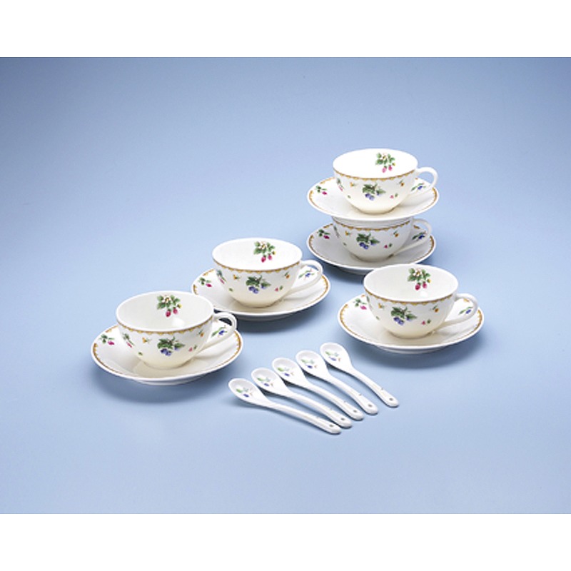 カップ(240ml)×5(φ95×55mm) (材:磁器)、ソーサー×5(φ142×22mm) (材:磁器)、スプーン×5(135mm) (材:磁器)