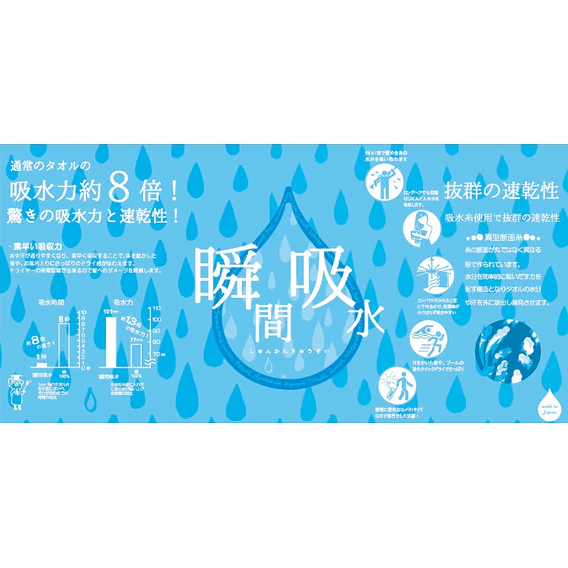 糸の断面が丸ではなく異なる形で作られている為、水分を効率的に吸い上げ放出する構造になっており、タオルの水分や汗を外に排出し蒸発させます。