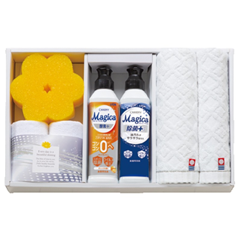 チャーミーマジカと、今治タオルやマイクロファイバークロスがセットになった、役立つキッチンギフトです。※マイクロファイバークロス、スポンジ、洗剤は今治タオルブランド商品ではございません。