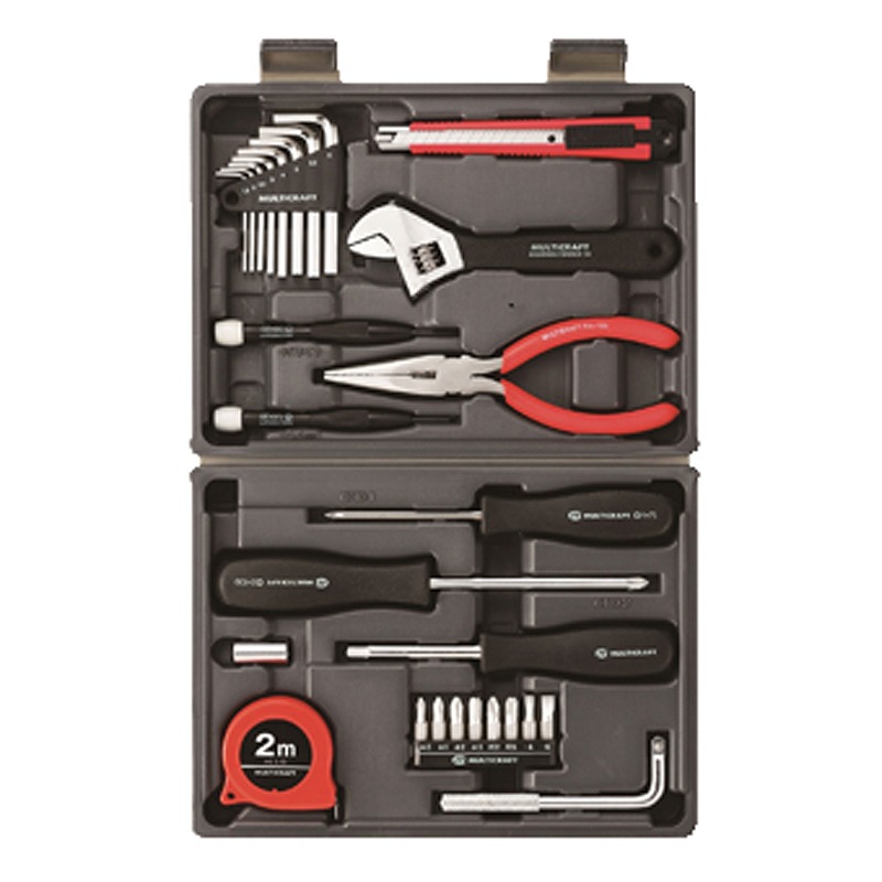 ケース×1(232×170×45mm)、六角棒レンチ×8 (材:炭素鋼)、モンキーレンチ×1 (材:炭素鋼)、ドライバー×2 (材:炭素鋼)、6.35mm角ビットアダプター×1 (材:炭素鋼)、コンベックス×1 (材:PP樹脂、炭素鋼)、精密ドライバー×2 (材:炭素鋼)、ラジオペンチ×1 (材:炭素鋼)、カッターS型×1 (材:炭素鋼、ABS樹脂)、スピンナーハンドル×1 (材:炭素鋼)、ドライバービット×8 (材:炭素鋼)、L型ハンドル×1 (材:炭素鋼)