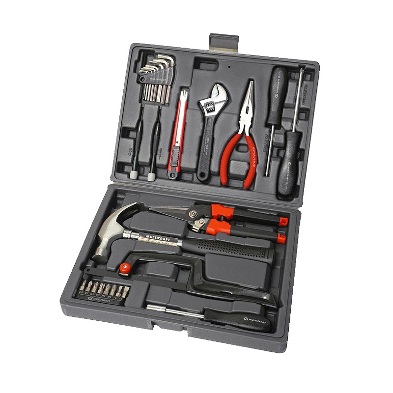 ケース×1(295×220×58mm)、ドライバー×2、ラジオペンチ×1、モンキーレンチ×1、カッターS型×1、六角棒レンチ×8、精密ドライバー×2、万能鋏×1、ネールハンマー×1、ハクソーフレーム×1、6.35mm角スピンナーハンドル×1、6.35mm角ビットアダプター×1、ドライバービット×8 (材:PE樹脂、炭素鋼)