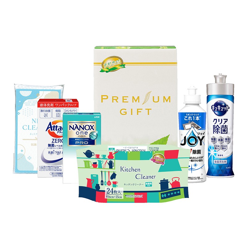 花王 アタックZEROワンパック7P×1、ライオン NANOXonePRO2P×1、花王 キュキュットクリア除菌220ml×1、P&G 除菌ジョイコンパクト170ml×1、キッチンクリーナー24枚×1、ネットクリーナー1P×1
