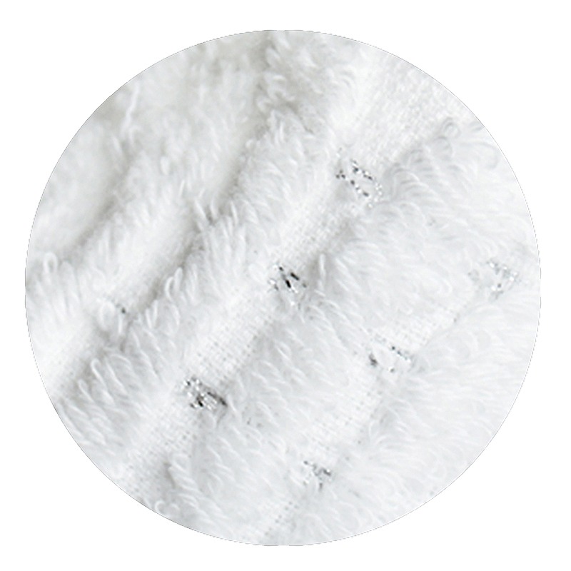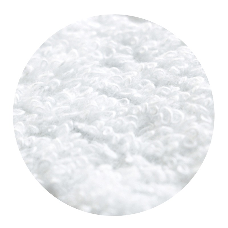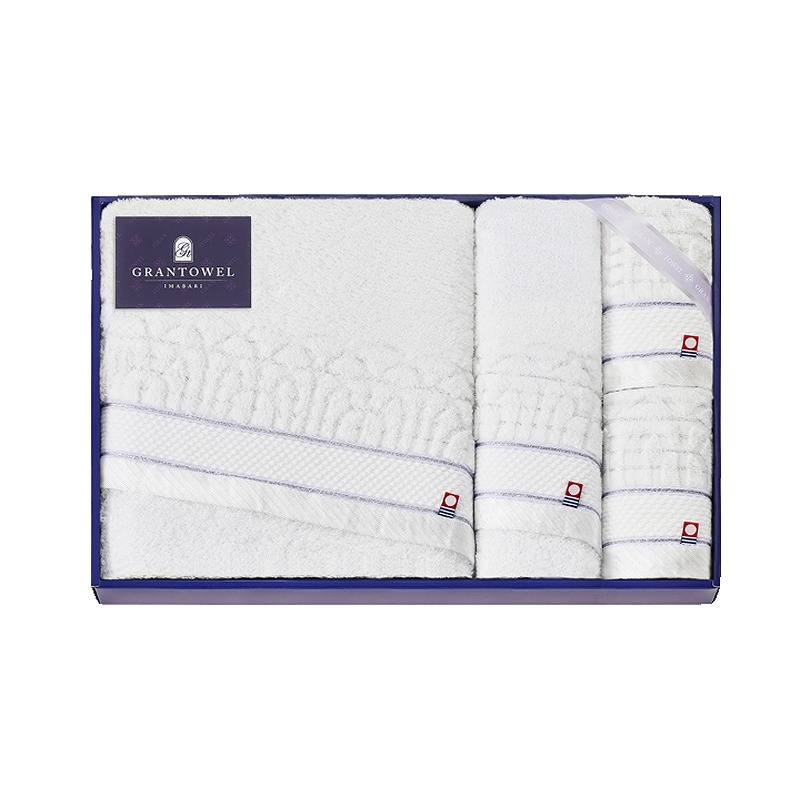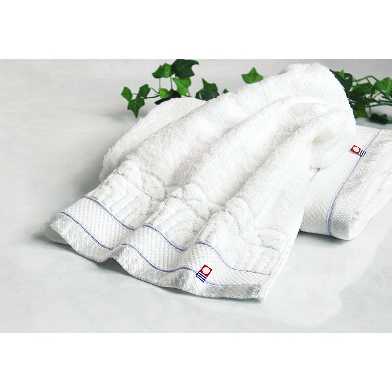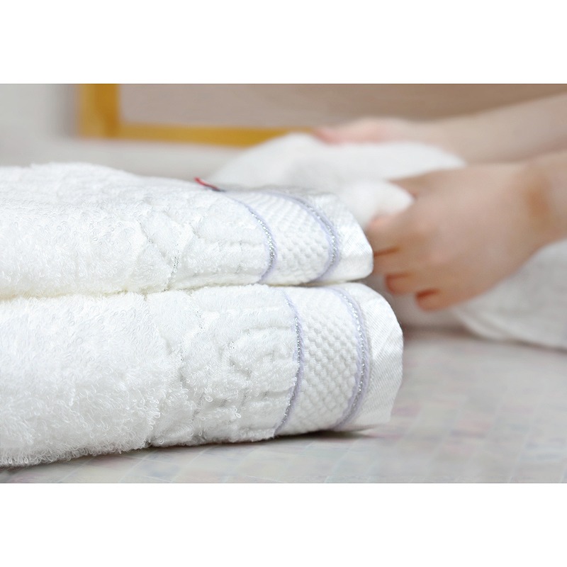 やわらかな甘撚り糸を使用することで、思わずほおずりしたくなる質感とボリュームに仕上げました。 連なるアーチにさりげなく織り込んだ光沢糸や、繊細かつ格調高い印象を与える銀糸と藤色のライン。 白く輝き、ふんわりと包み込む、今治の美しく心地良いタオルをお届けします。
