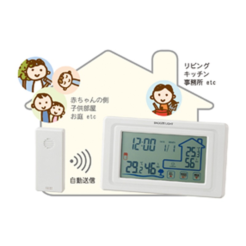 時計、アラーム、スヌーズ、カレンダー、室内温湿度計、室外温湿度計、快適度表示(室内)、バックライト、タッチスクリーン