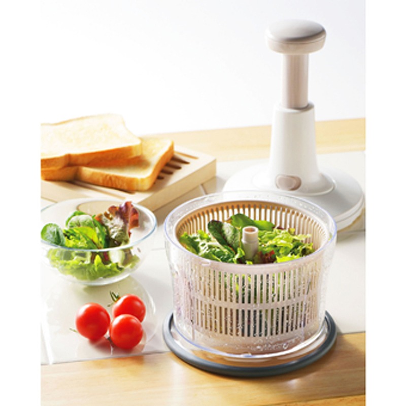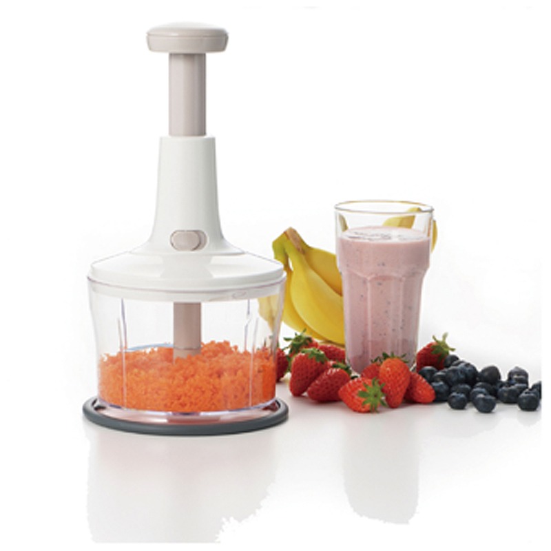 上から押すだけで簡単にみじん切りができ、押す回数で食材の細かさを調整できます。また、付属の部品を使用すれば、水切り器や泡立て器としてもお使いいただけます。