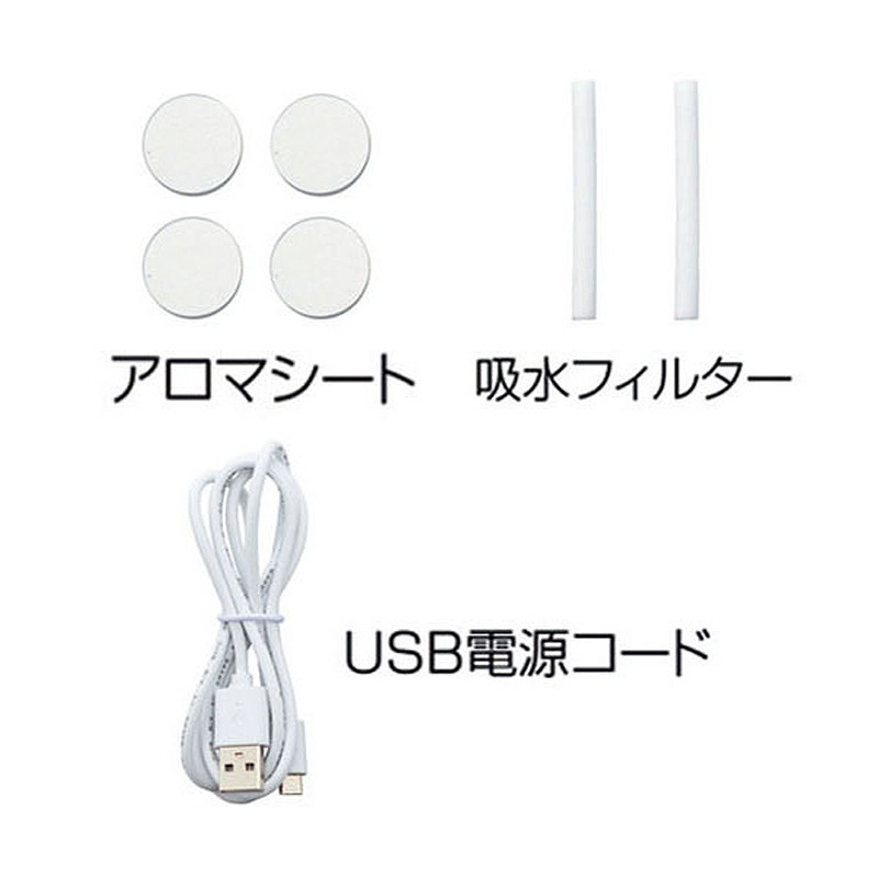 本体×1(φ130×105mm) (材:ABS樹脂、PP、PC、シリコーンゴム)、USB電源コード×1(800mm)、吸水フィルター×2、アロマシート×4