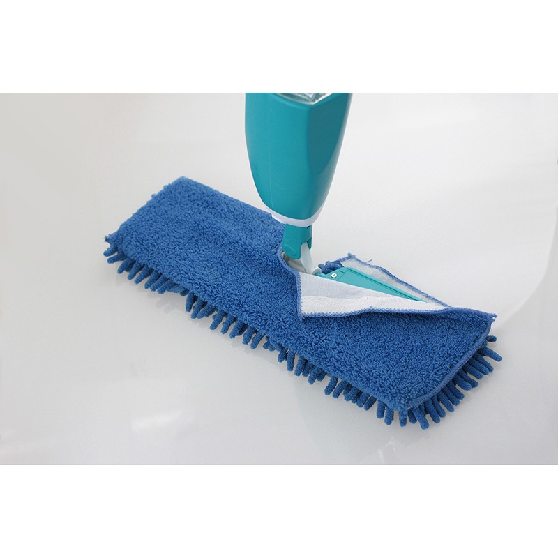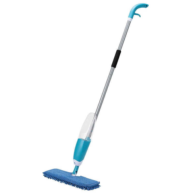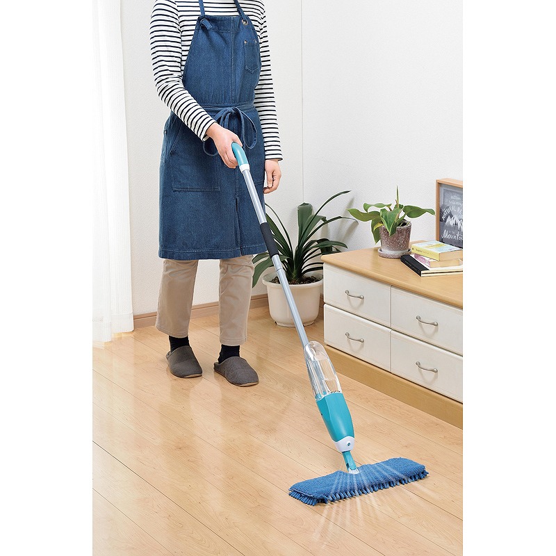 ボトルに水を入れてシュッとスプレー。立ったまま水拭き掃除ができます。モップは毛短面と毛長面のリバーシブル仕様で使い分けできます。