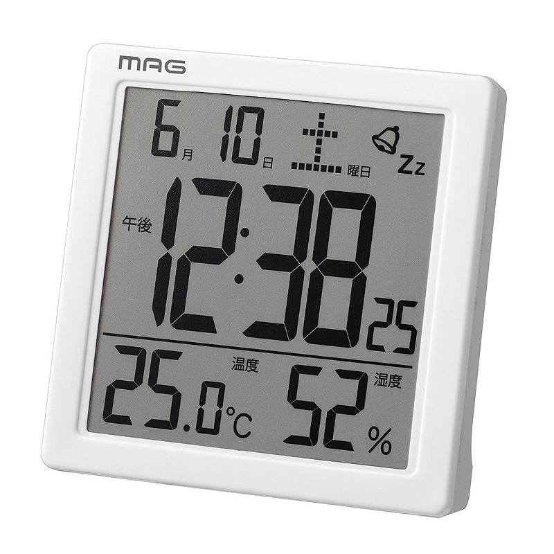 電子音アラーム、スヌーズ、タッチセンサー式ライト、カレンダー表示、温度・湿度表示、12/24時間表示切替機能
