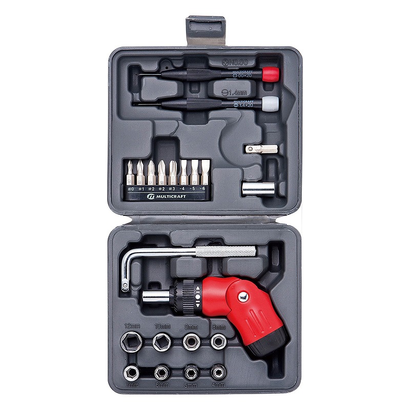 ケース×1(145×130×55mm)、精密ドライバー×2、ドライバービット×8、6.35mm角ソケット×8、6.35mm角ビットアダプター×1、6.35mm角ソケットアダプター×1、ラチェットドライバーハンドル×1、L型ハンドル×1 (材:炭素鋼、PE樹脂、ABS樹脂)