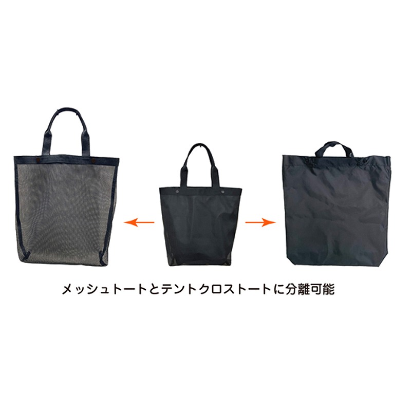 いざという時は2種類のバッグに分離できます。 1.見せたい物と見せたくない物、汚れた物と汚したくない物を分けて収納可能。 2ボタンを外す事で2種類のバッグに分離可能。 3.メッシュごしに見えるさりげない名入れ。 4.速乾性に優れたメッシュトートと、撥水性に優れたテントクロストートの2層構造。