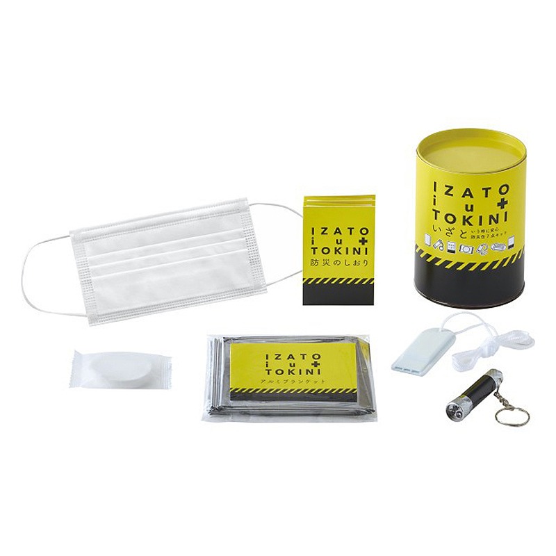 缶×1 (材:SPTE)、ミニライト×1、フラットホイッスル×1、圧縮タオル×1、アルミシート×1(1800×1050mm)、防災のしおり×1、マスク×1