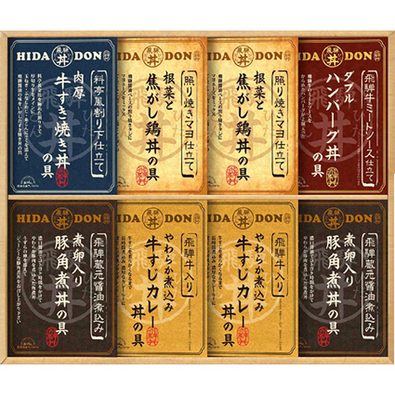飛騨牛仕込み牛すじカレー丼の具(180g)×2、照り焼きマヨ仕立て根菜と焦がし鶏丼の具(160g)×2、料亭風割り下仕立て牛すき焼き丼の具(170g)×1、飛騨牛ミートソース仕立てWハンバーグ丼の具(180g)×1、飛騨蔵元醤油煮込み豚角煮丼の具(170g)×2