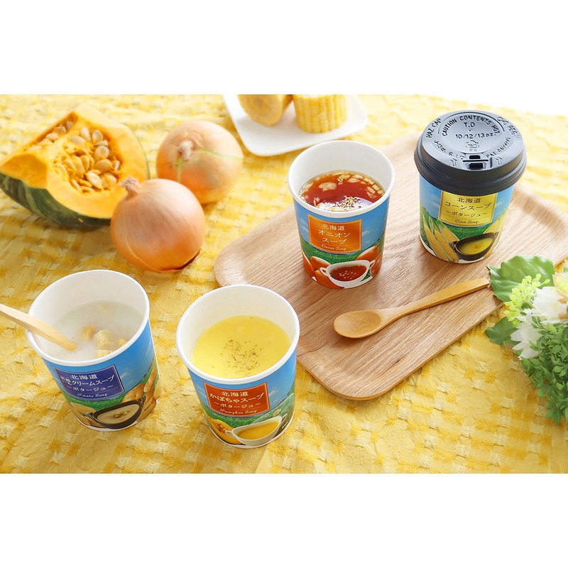 北海道素材のカップスープに、レトルトのカレーやハンバーグをセットにしたお手軽なグルメセットです。
