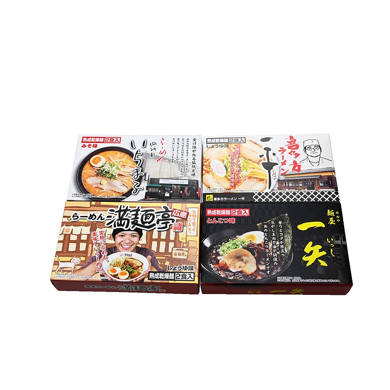 札幌らーめん「四代目いちまる」味噌味(麺70g×2、スープ50g×2)×1、喜多方ラーメン「一平」醤油味(麺70g×2、スープ40g×2)×1、広島ラーメン「満麺亭」醤油味(麺70g×2、スープ45g×2)×1、博多中州「一矢」とんこつ味(麺70g×2、スープ32g×2、調味油6g×2)×1