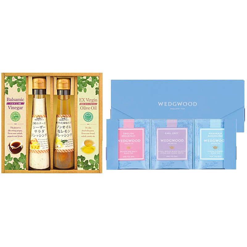 2種のイタリアンチーズシーザーサラダドレッシング(120ml)×1、瀬戸内花藻塩仕立てノンオイル塩レモンドレッシング(120ml)×1、エクストラバージンオリーブオイル(8g)×8、ウェッジウッドティーバッグ(イングリッシュブレックファスト)(2g)×3、ウェッジウッドティーバッグ(アールグレイ)(2g)×3、ウェッジウッドティーバッグ(マハラジャダージリン)(2g)×3、バルサミコ酢(3.3ml)×8
