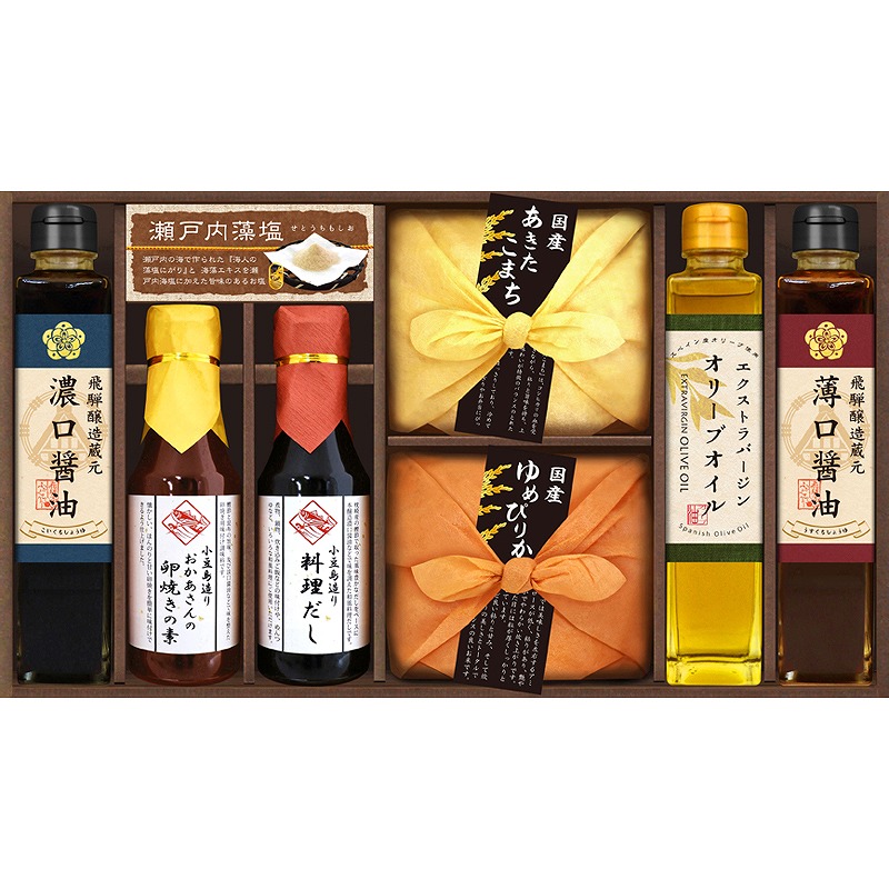 国産あきたこまち(300g)×1、国産ゆめぴりか(300g)×1、小豆島造り料理だし(150ml)×1、小豆島造り卵焼きの素(150ml)×1、飛騨高山濃口醤油(200ml)×1、飛騨高山薄口醤油(200ml)、エクストラバージンオリーブオイル(165g)、瀬戸内藻塩(80g)