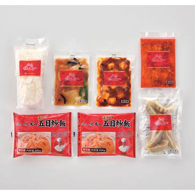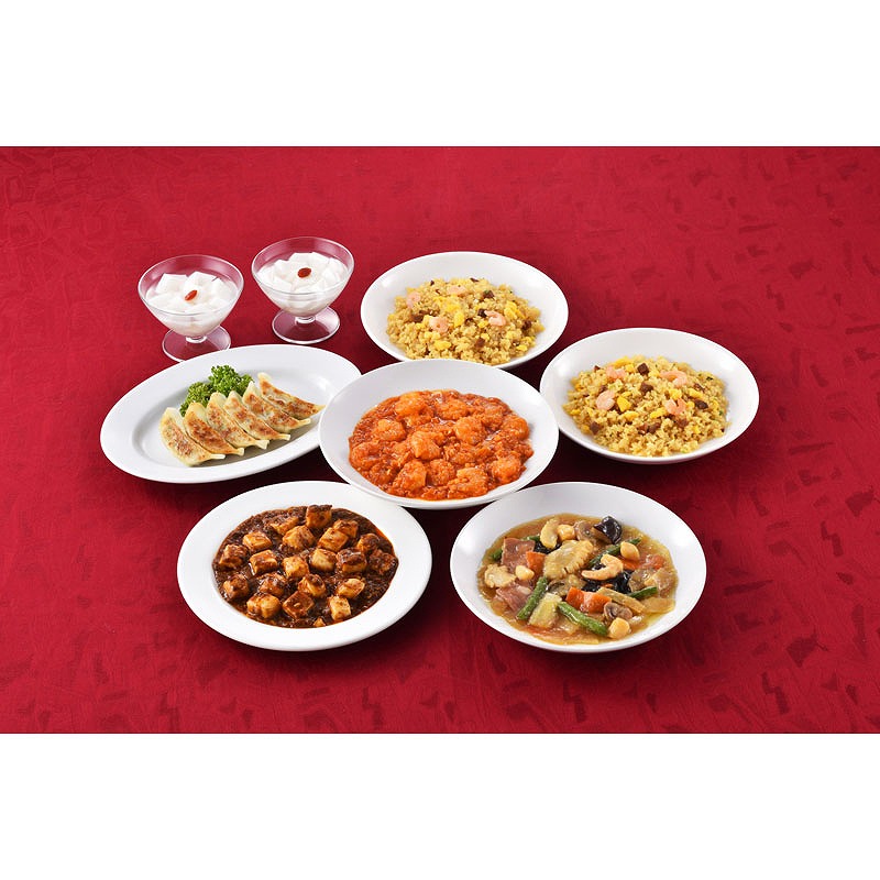 餃子(6個120g)×1、本格四川麻婆豆腐(150g)×1、乾焼蝦仁(エビチリソース)(150g)×1、本格八宝菜(150g)×1、ふっくら五目炒飯(200g)×2、杏仁豆腐(500g)×1