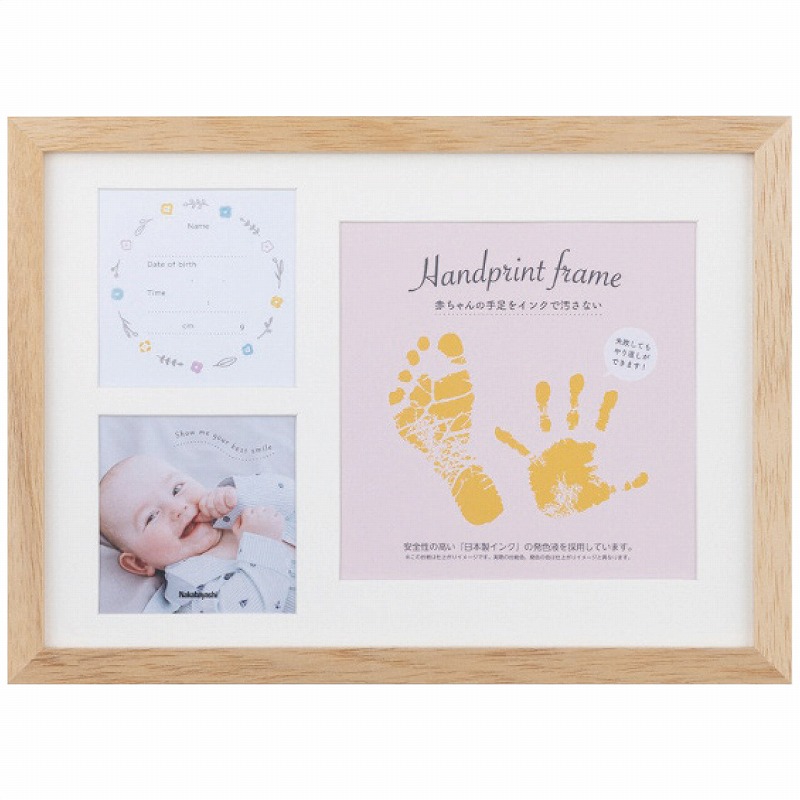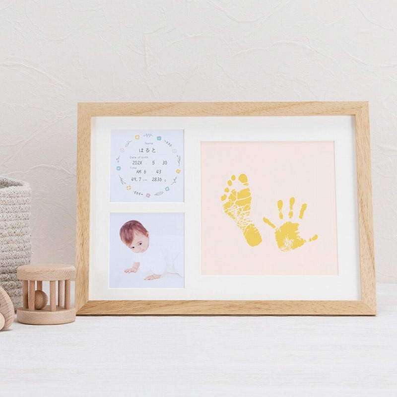 写真と一緒に手形・足形を残せるフォトフレームです。身近な人や大切な人へ贈る記念品として、また大切な記念日をカタチとして残すのに最適です。赤ちゃんの手足をインクで汚さずに、手形足形が残せます。失敗してもやり直しが可能です。安全性の高い「日本製インク」の発色液を採用しています。お名前や誕生の記録を書き込むことができる記録スペース付き。<ご使用上の注意>お子様の手足のサイズによっては発色紙に手形足形が入り切らない場合があります。窓寸法をご確認ください。