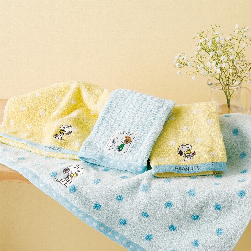 PEANUTSからハグをテーマに、スヌーピーが仲間に寄り添うシーンをモチーフにしました。 ハグするスヌーピーから優しさや思いやりが伝わるデザインです。 ドットとストライプのシンプルなパターンは子どもから大人まで使いやすく、内祝いにおすすめです。