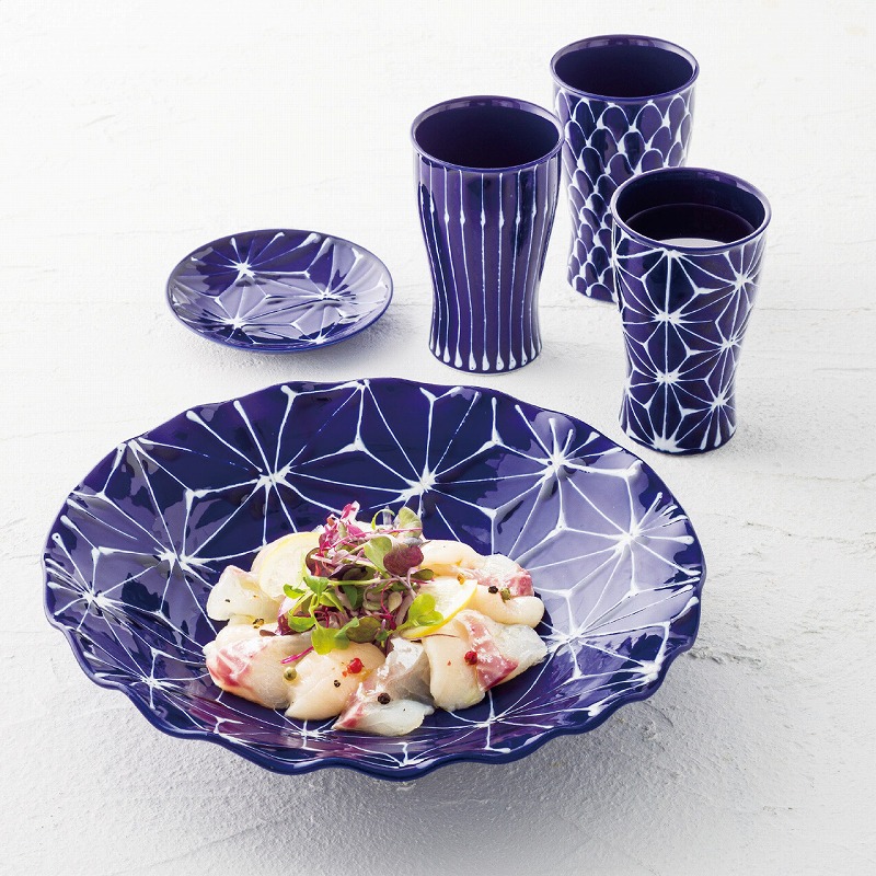 瑠璃釉を基調に白イッチンで一線一線描かれた「麻の葉」贅沢な器は、江戸切子のような伝統的意匠を感じさせる。