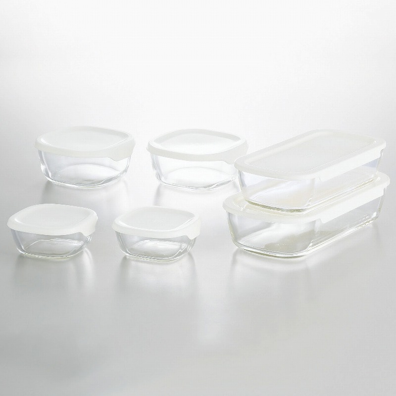 27×14.5×6.2cm容量1.4l保存容器・23.8×12.5×5.6cm容量900ml保存容器各1個・14.3×13.9×6.2cm容量600ml保存容器・11.1×10.7×4.7cm容量250ml保存容器各2個・本体:耐熱ガラス・フタ:ポリプロピレン 2880g
