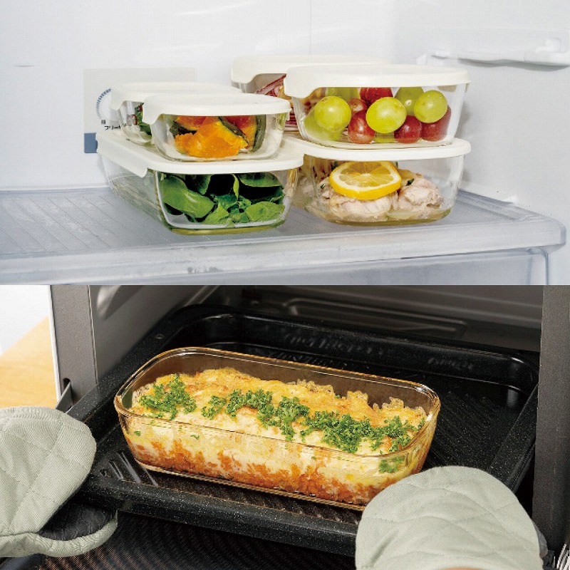 調理してそのまま食卓へ。長方形の保存容器は冷蔵庫の奥行きを活かした省スペース収納。フタをしたまま電子レンジ、フタを外してオーブンOKです。