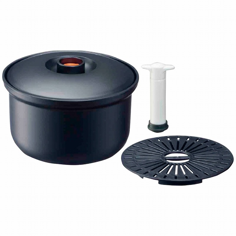 直径18.1cm高11.9cm容量1.6lおひつ1個・本体、蓋、スノコ:ポリプロピレン・パッキン、エアーバブル:シリコン樹脂・6.4×4.1×13.7cm真空ポンプ1個・本体、ハンドル、支柱:ABS樹脂・リング:シリコン樹脂・ジョイント部:ポリエチレン 665g
