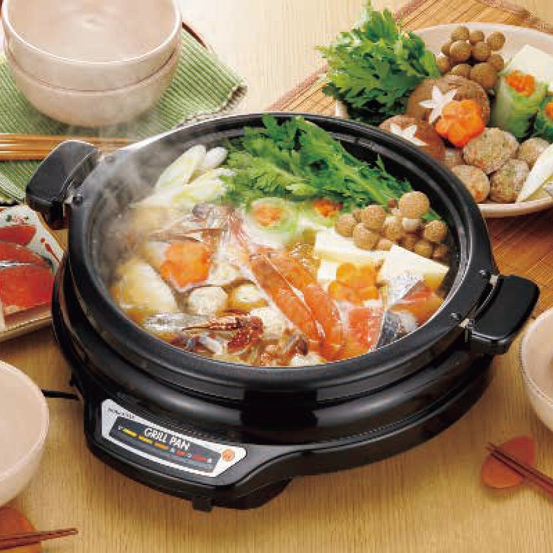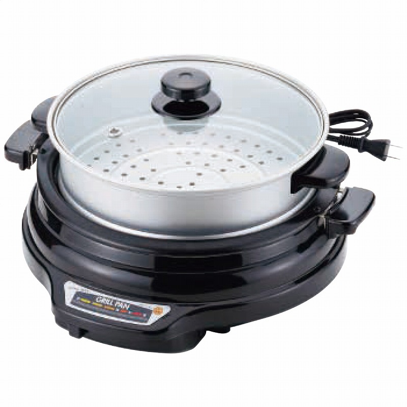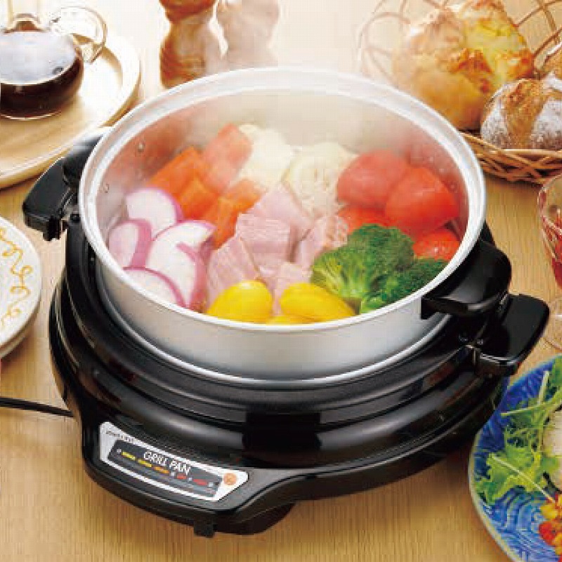 39×36.5×23.5cm・本体、蒸し鍋取っ手:ポリプロピレン・鍋取っ手:フェノール樹脂・蓋ツマミ:PA樹脂・鍋:アルミ板(フッ素樹脂塗装)・蒸し鍋:アルミ板(アルマイト加工)・消費電力:1200W・コード長:約1.8m 3450g