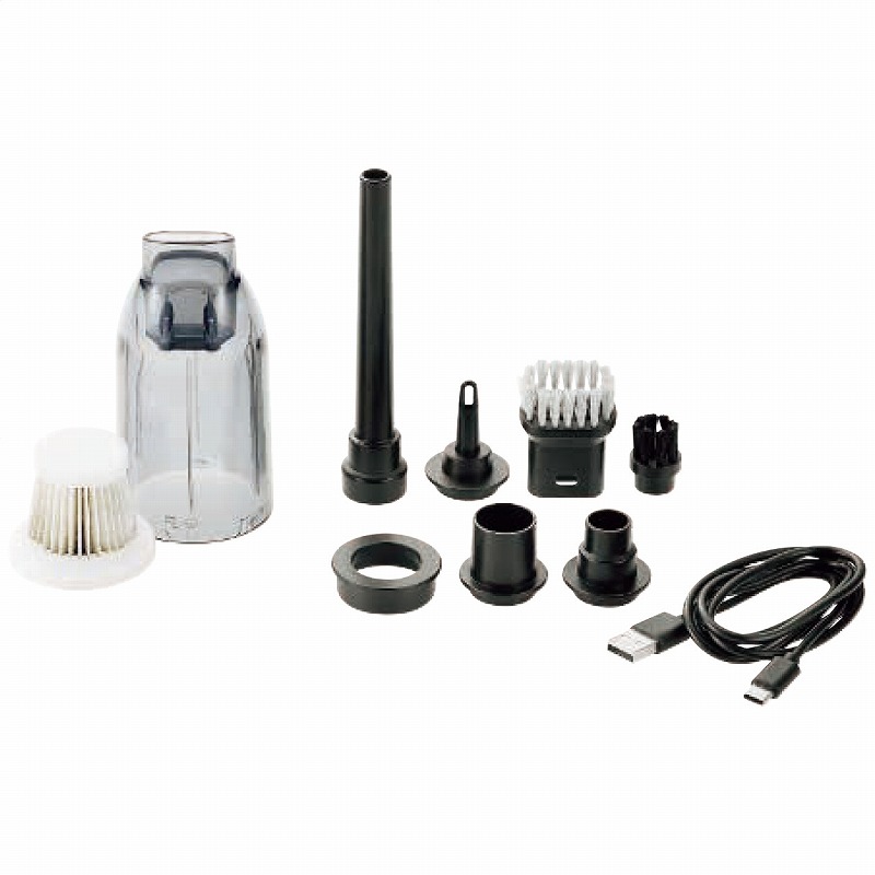 6×6×16cm・ABS樹脂、ポリカーボネート・コード長:約1m・ダストケース、フィルター、クリーナーブラシ、ジョイントパーツ、ロングノズル、フロアーブラシ、ワイドノズル、ショートノズル、エアーノズル、USBケーブル付 630g
