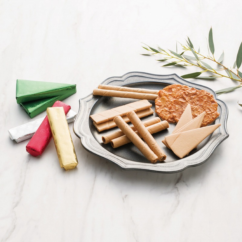 エコルセ三角8包(24枚)・短冊8包(16枚)・丸型(ミルクチョコ・ホワイトチョコ)各4包(各8本)・マンデルチーゲル16枚・モンロワ(アーモンド10包(20本)・ヘーゼルナッツ5包(10本)) 1069g