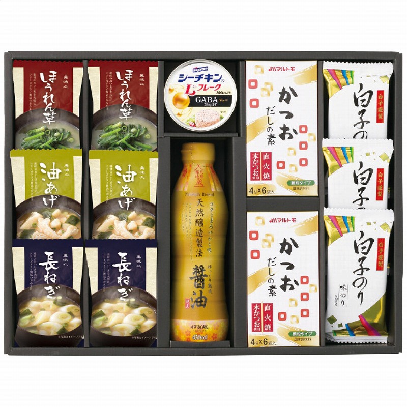 フリーズドライ味噌汁(油あげ7.2g・ほうれん草6.2g・長ねぎ6.3g)・マルトモかつおだしの素(4g×6個)各2個・伊賀越天然醸造醤油450ml×1本・白子のり味のり(8切5枚)3個・シーチキンLフレークGABA入り70g×1缶 1400g