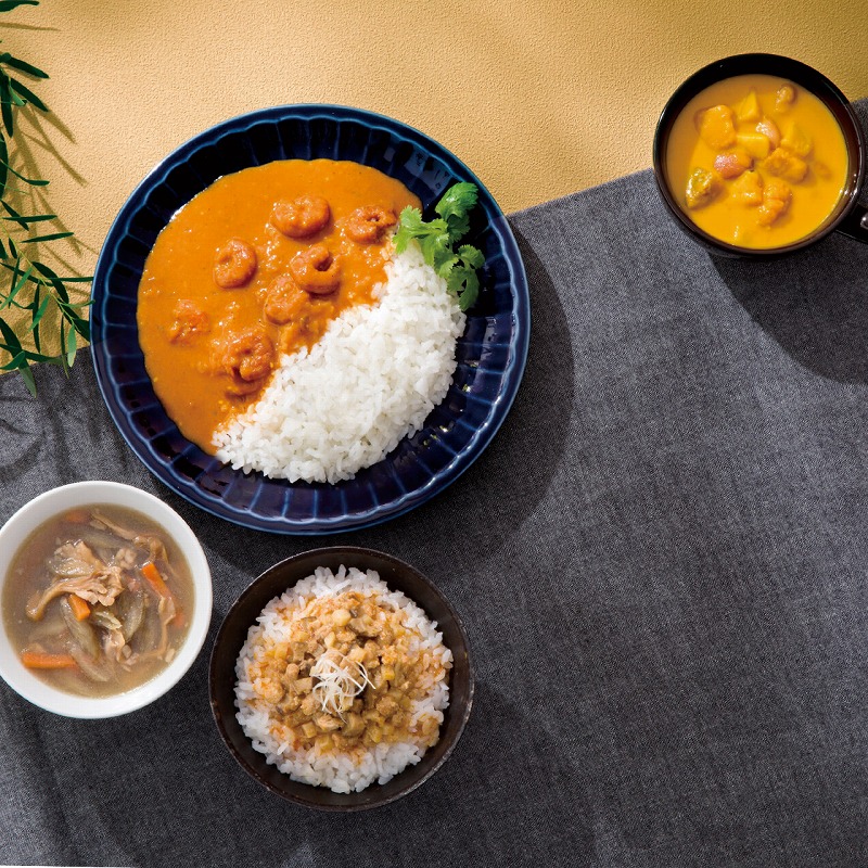 ごはん1杯にかけるだけで満足感のある味わいを楽しめるかけごはんと、ごはんに合う具材しっかりのおかずスープのセット。