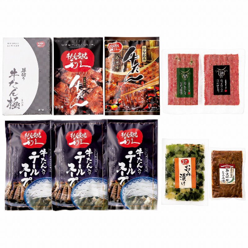牛たん真空パック(塩味100g・味噌味110g)・牛たん真空パック(極)120g・牛たんおつまみ50g(ペッパー・わさび)・南蛮味噌100g・おみ漬け100g各1個・冷凍テールスープ250g×3個 1670g