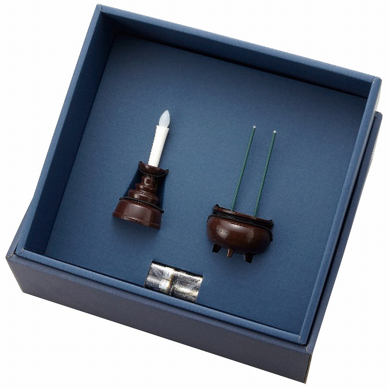 直径4.3cm高さ10cmろうそく1個・ポリプロピレン、ABS樹脂・直径5.5cm高さ11cm線香1個・ABS樹脂・単5電池4本付 370g