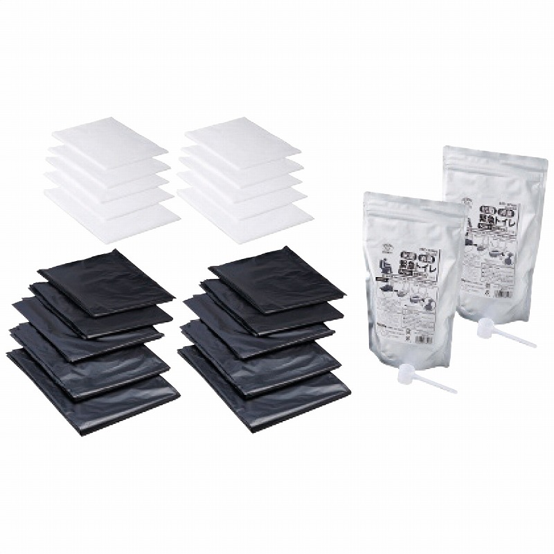 スプーン2個・PP樹脂・65×80cm汚物袋・18×45cm処理袋各100枚・PE樹脂・凝固剤50回分×2袋・高分子吸水樹脂 2500g