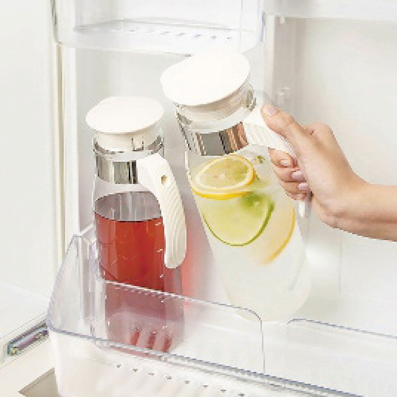 耐熱ガラス製の大容量タイプ。スリムだから冷蔵庫のドアポケットに収納できます。