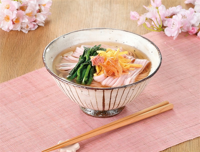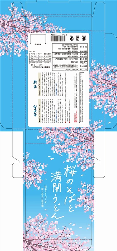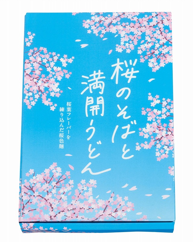 澄んだ青空に桜の花びらが舞い散る、華やかさとはかなさを表現したパッケージデザインが”エモい”桜そばとうどんのセット。賞味期限が300日と長いため、長期のイベントにもおすすめです。