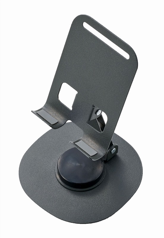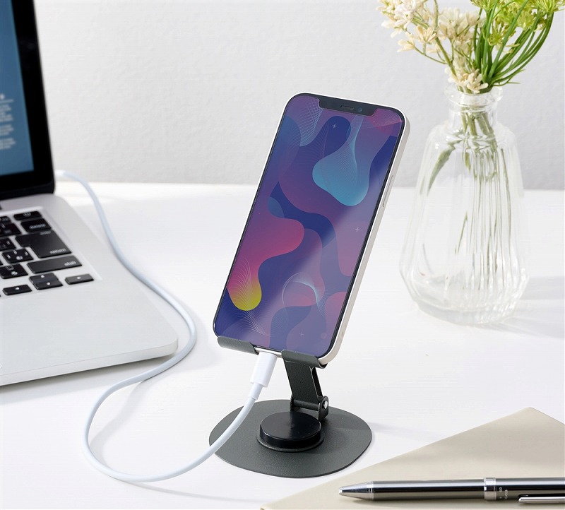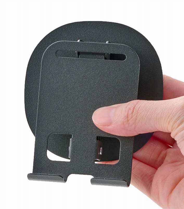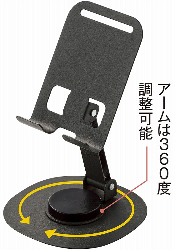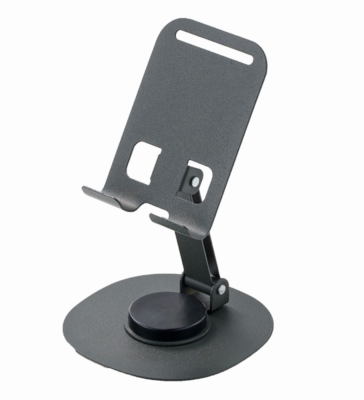 クールなブラックボディのスチール製スマホスタンド。充電しながら使えて、持ち運びにも便利な折りたたみ式